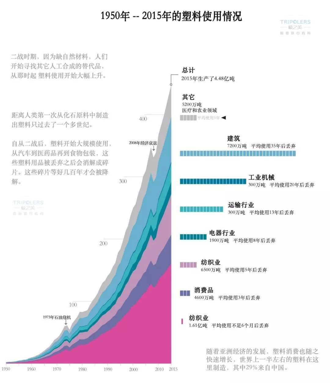 自1869年,美國人J.W.海厄特發(fā)現(xiàn)了賽璐珞(塑料的一種)并在三年后投入量產(chǎn)以來,塑料的運(yùn)用已經(jīng)有140多年的歷史了。塑料因?yàn)橘|(zhì)地輕、不會(huì)銹蝕、耐沖擊、加工成本低、絕緣性好等優(yōu)點(diǎn),被廣泛的用于服裝、烹飪、餐飲、產(chǎn)品設(shè)計(jì)、工程以及零售等行業(yè),已經(jīng)成為生活中不可或缺的一部分。短短半個(gè)世紀(jì),全球塑料產(chǎn)量從每年200萬噸激增至2016年的3.8億噸,增速是全球GDP的3倍。